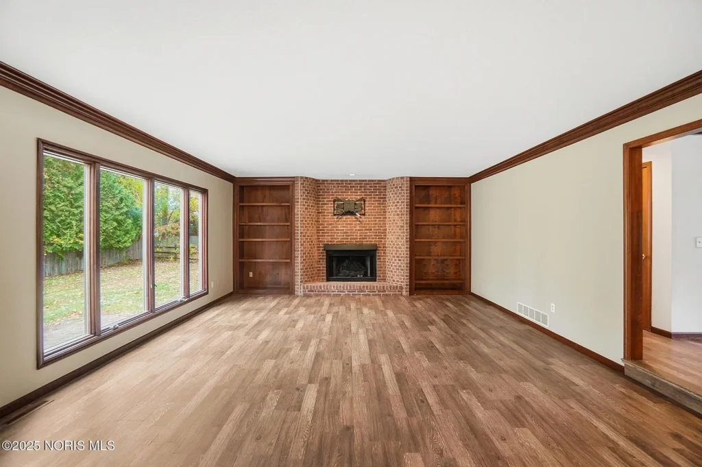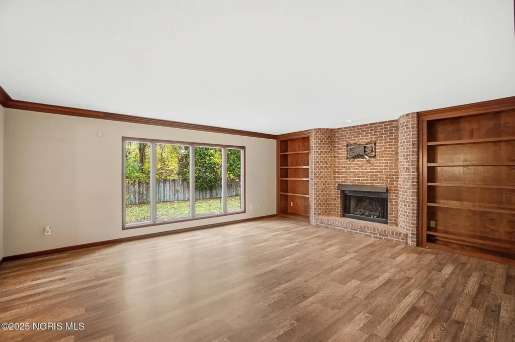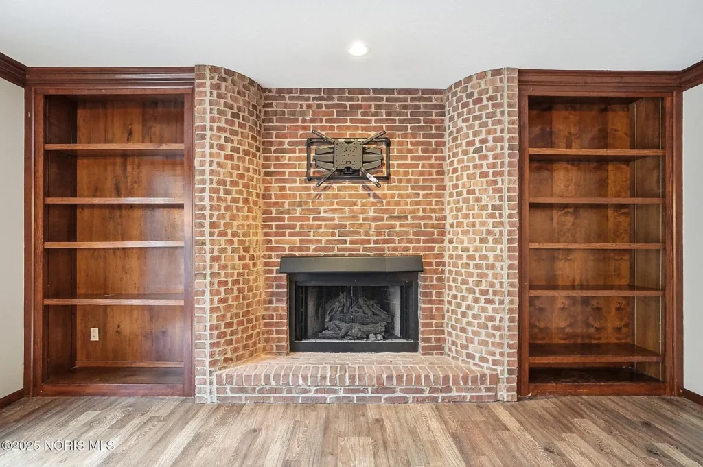 At the heart of the home is the warm and comfortable family room. This space is anchored by a brick-surround fireplace—a perfect focal point during cooler months—and includes custom built-ins that elevate both function and charm. Whether used for casual evenings in or weekend movie nights, the room is designed for relaxation and connection.