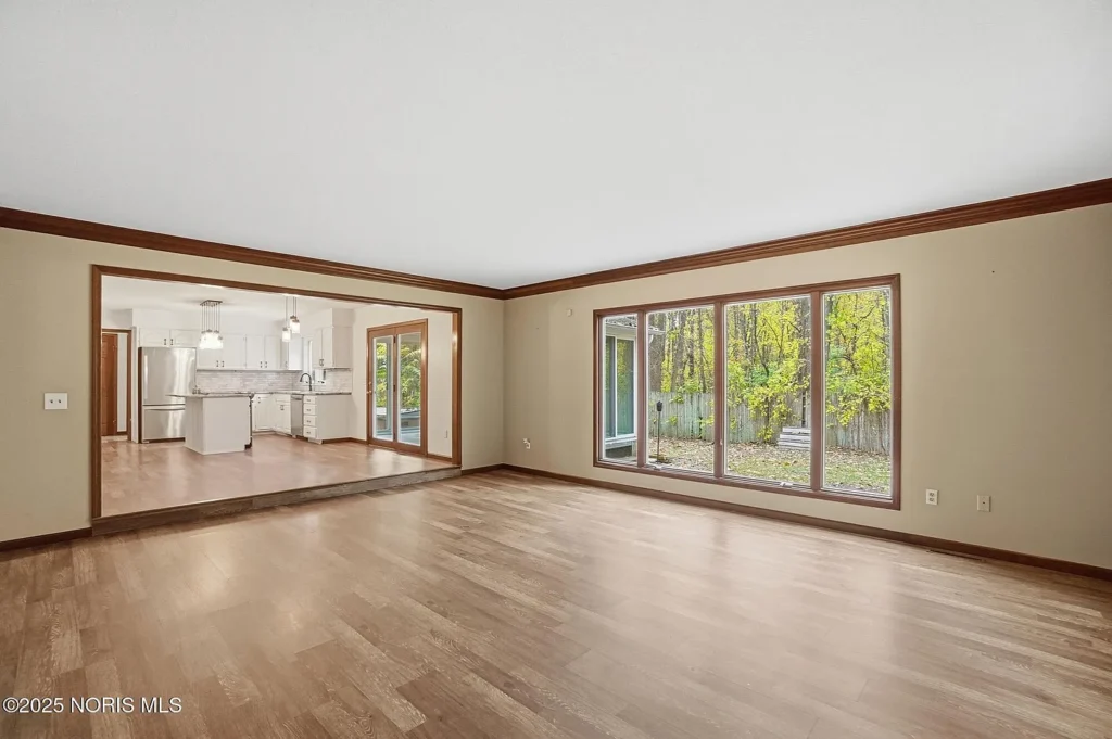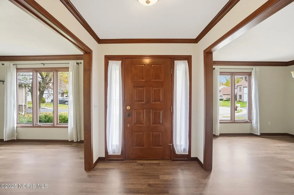 The living room, situated just off the entryway, is bright and inviting, featuring classic crown molding and ample natural light. This versatile space works perfectly for hosting guests or enjoying a quiet moment away from the home’s busier areas. Adjacent to the living room is a formal dining room that provides the ideal setting for holiday gatherings, dinner parties, or family celebrations.