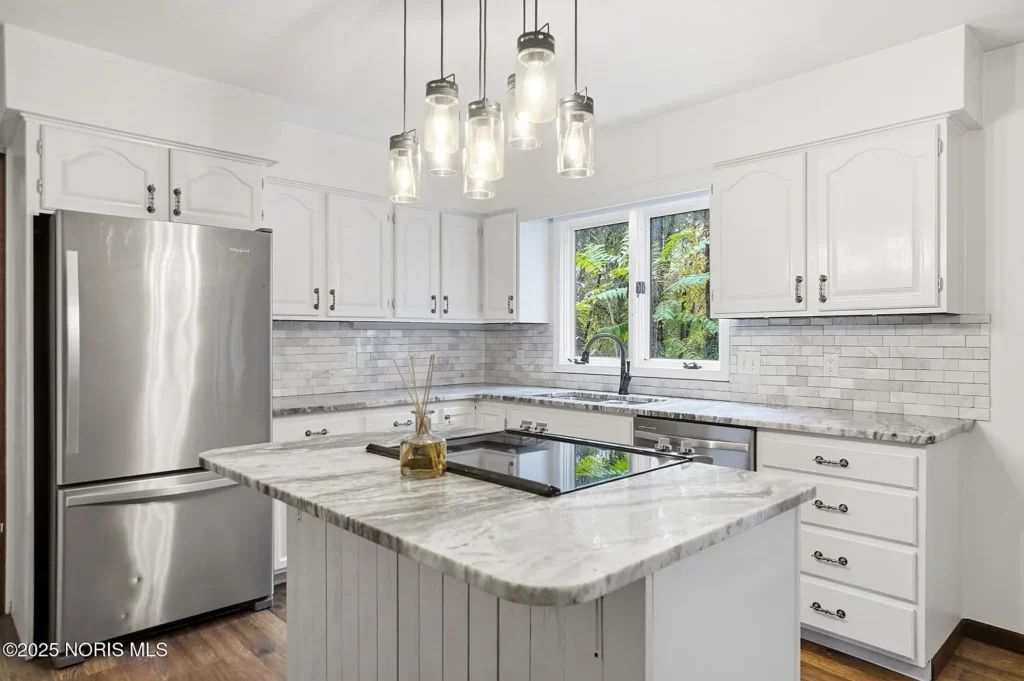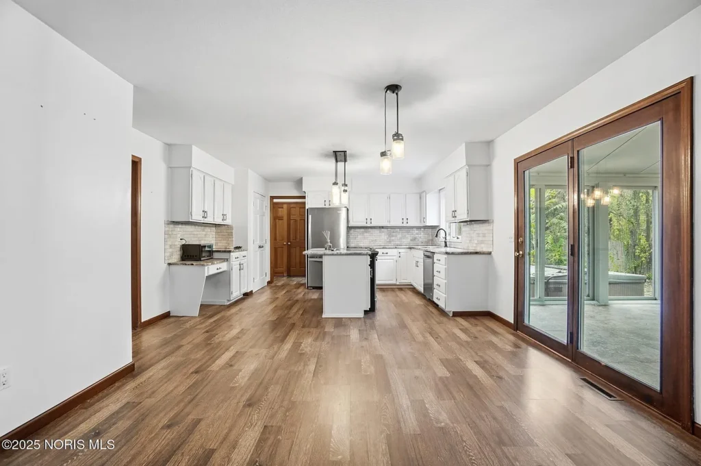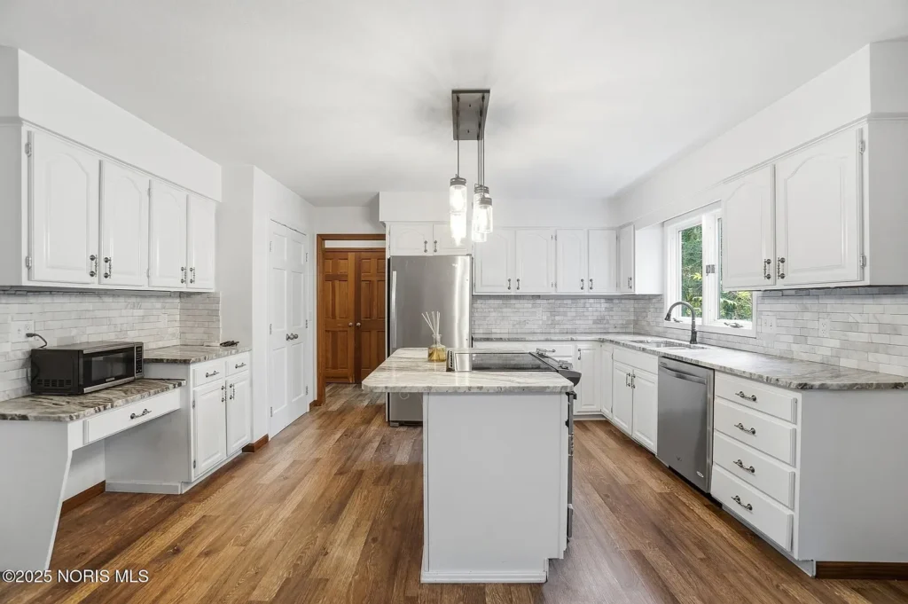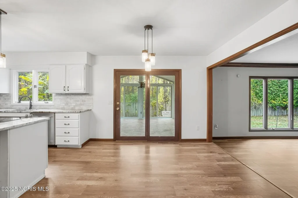 The gourmet eat-in kitchen is sure to impress anyone who enjoys cooking or entertaining. It features granite countertops, a center island for meal prep or serving, and a stylish tile backsplash that ties the room together. The built-in desk area offers a convenient nook for managing household tasks, working from home, or keeping school schedules organized. All appliances are included, making the kitchen fully move-in ready. A set of glass doors leads from the kitchen to one of the home’s most treasured features: the three-season sunroom.